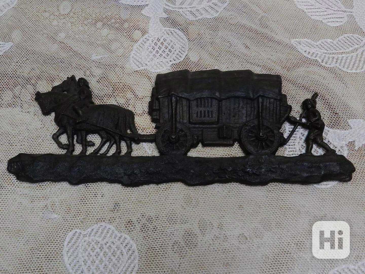Starý kovový Relief s koňským povozem, vojáci?