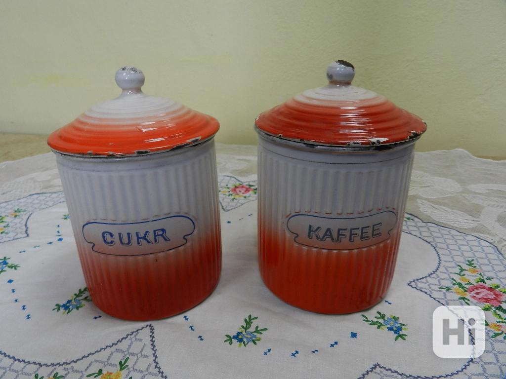Velmi staré kovové Kořenky, smalt, Káva a Cukr - B. Fres Austria.