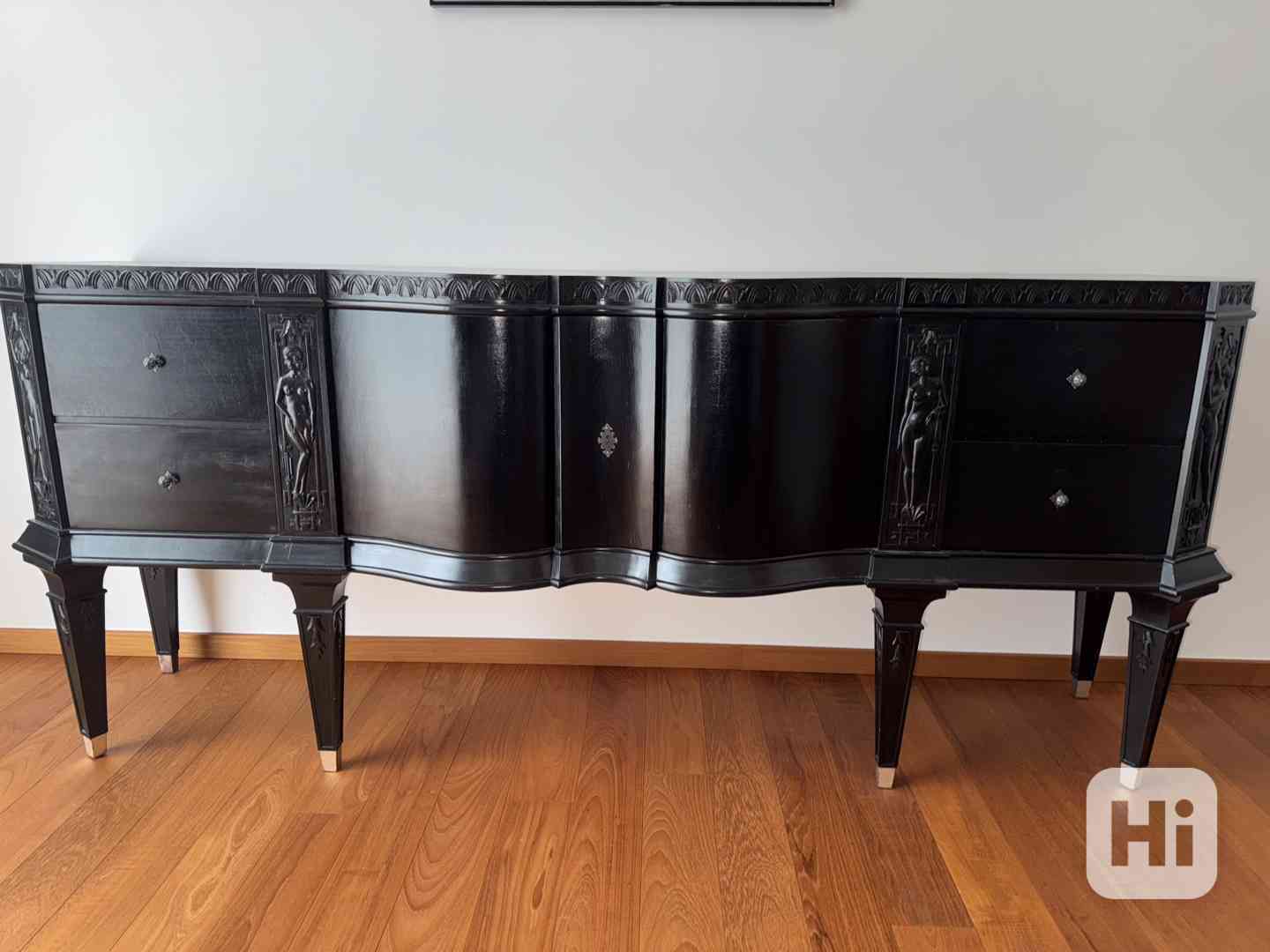 Nabízím reprezentativní secesní komodu z počátku 20. století, provedenou v elegantním černém laku s bohatými ručně řezanými dekorativními prvky. Jedná se o výrazný a vzácný kus nábytku, který v sobě spojuje uměleckou hodnotu, noblesu a plnou funkčnost. Délka 208 cm/ šířka 47 cm/ výška 90 cm.