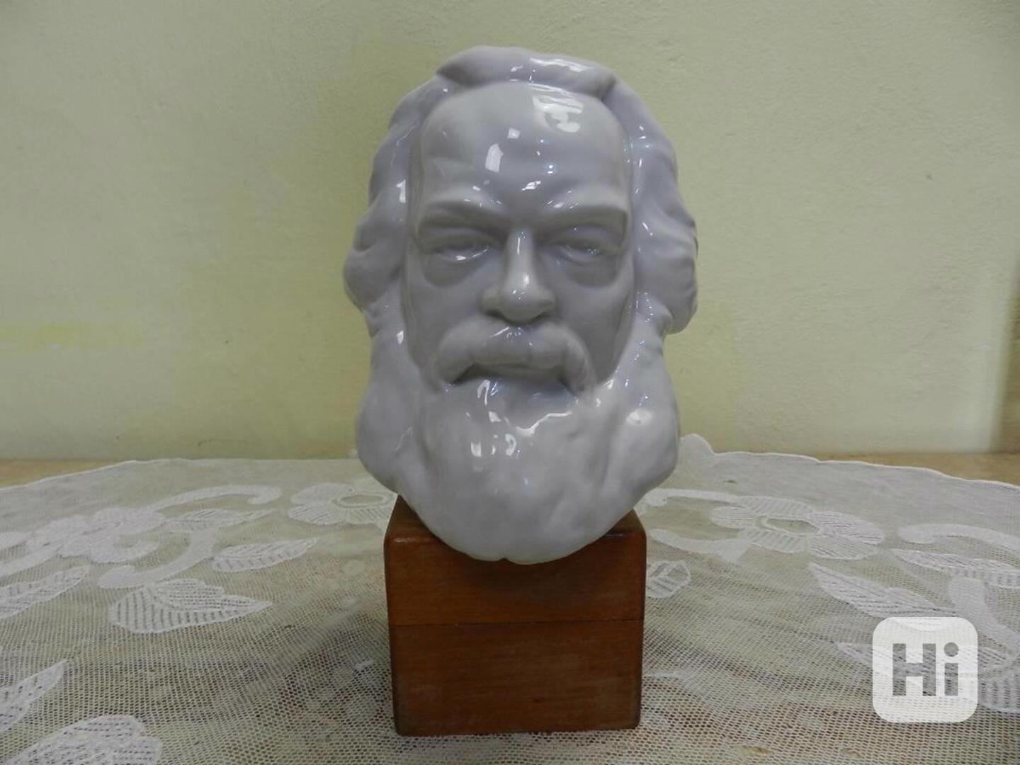 Velmi zdařilá signovaná porcelánová busta na dřevěném soklu, Karel Marx - Volkstedt Německo, kolem pol. 20 stol.
