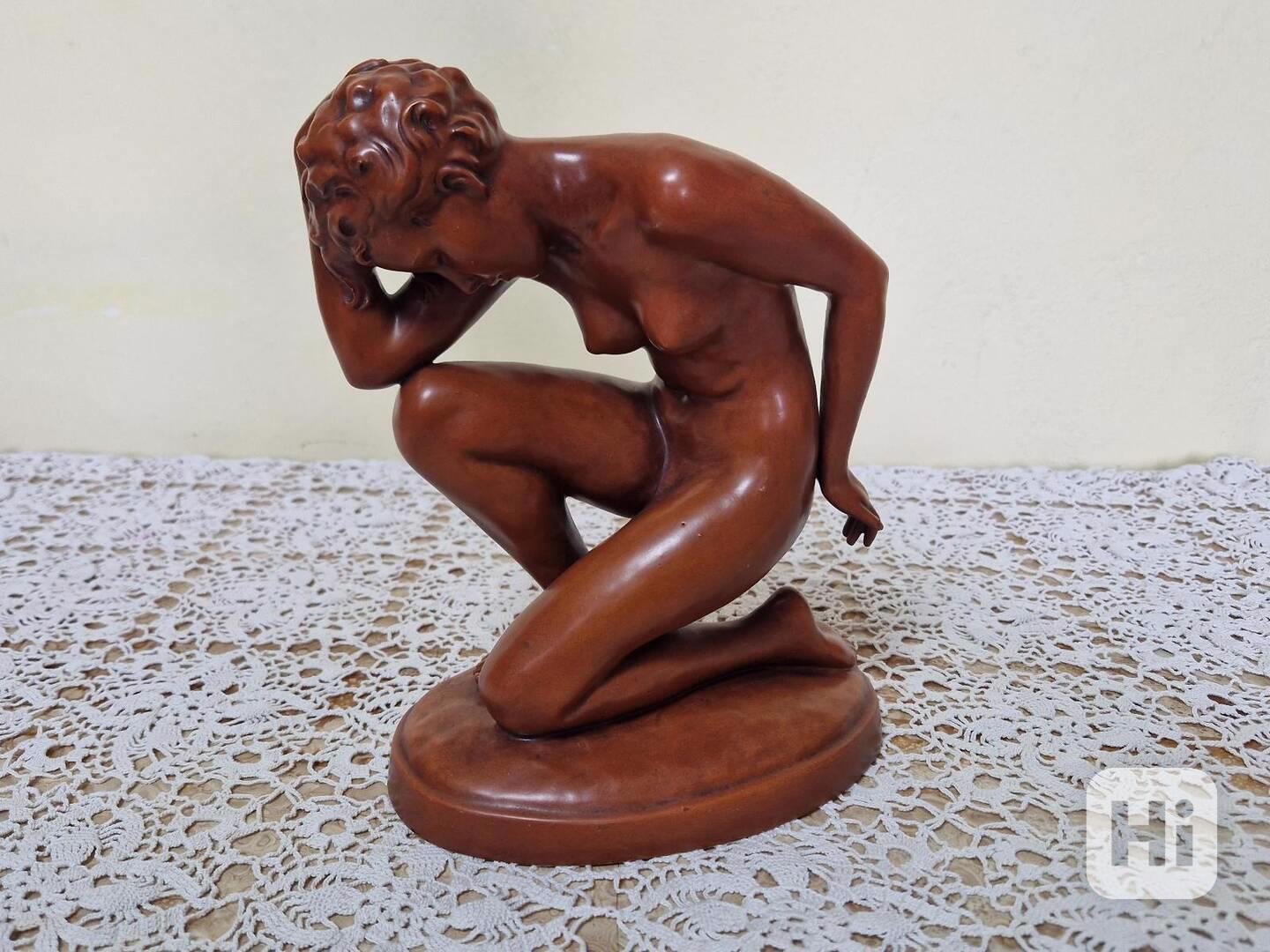 Málo vídaná porcelánová plastika, Dívčí Akt, vzácné barevné provedení, značeno čísly - Royal Dux, 1 pol. 20 stol.Rozměry: výška 25cm.