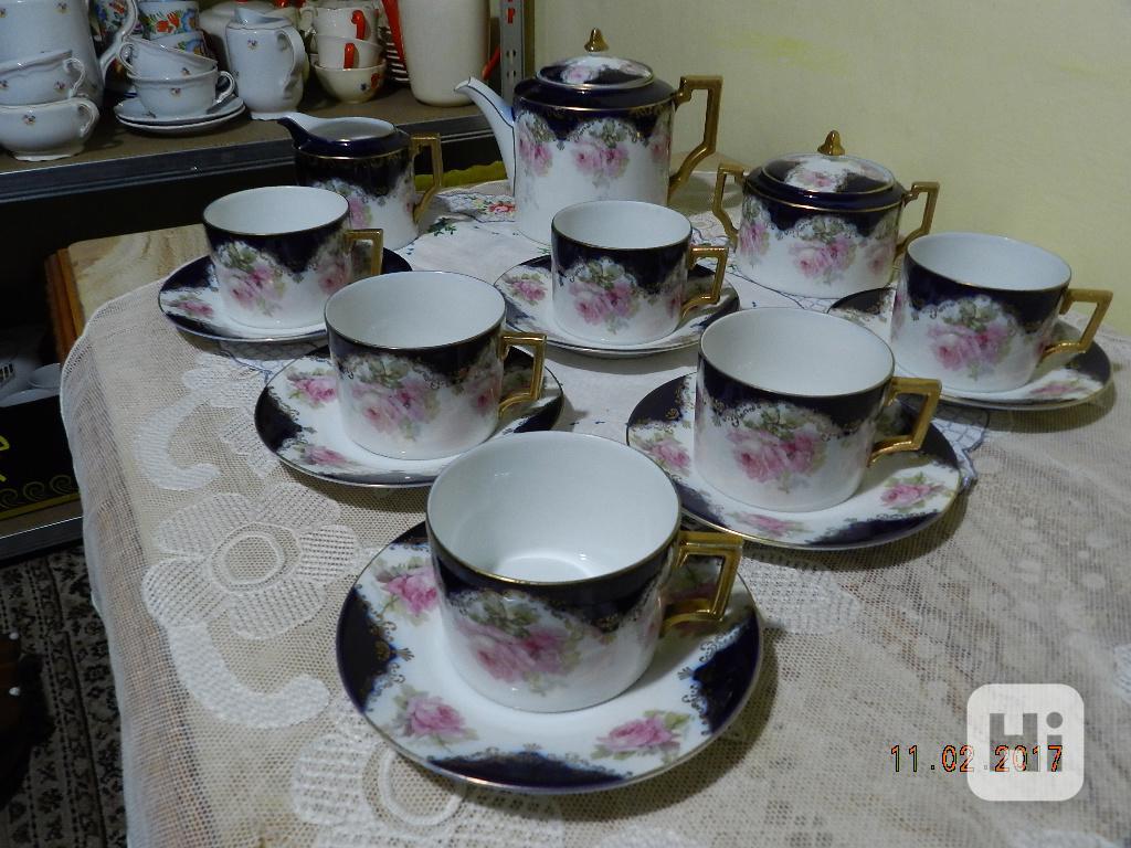 Krásný secesní servis pro 6 osob, motivy růží, kobalt, zlaceno - Carl Knoll Rybáře Karlsbad, kolem 1900.