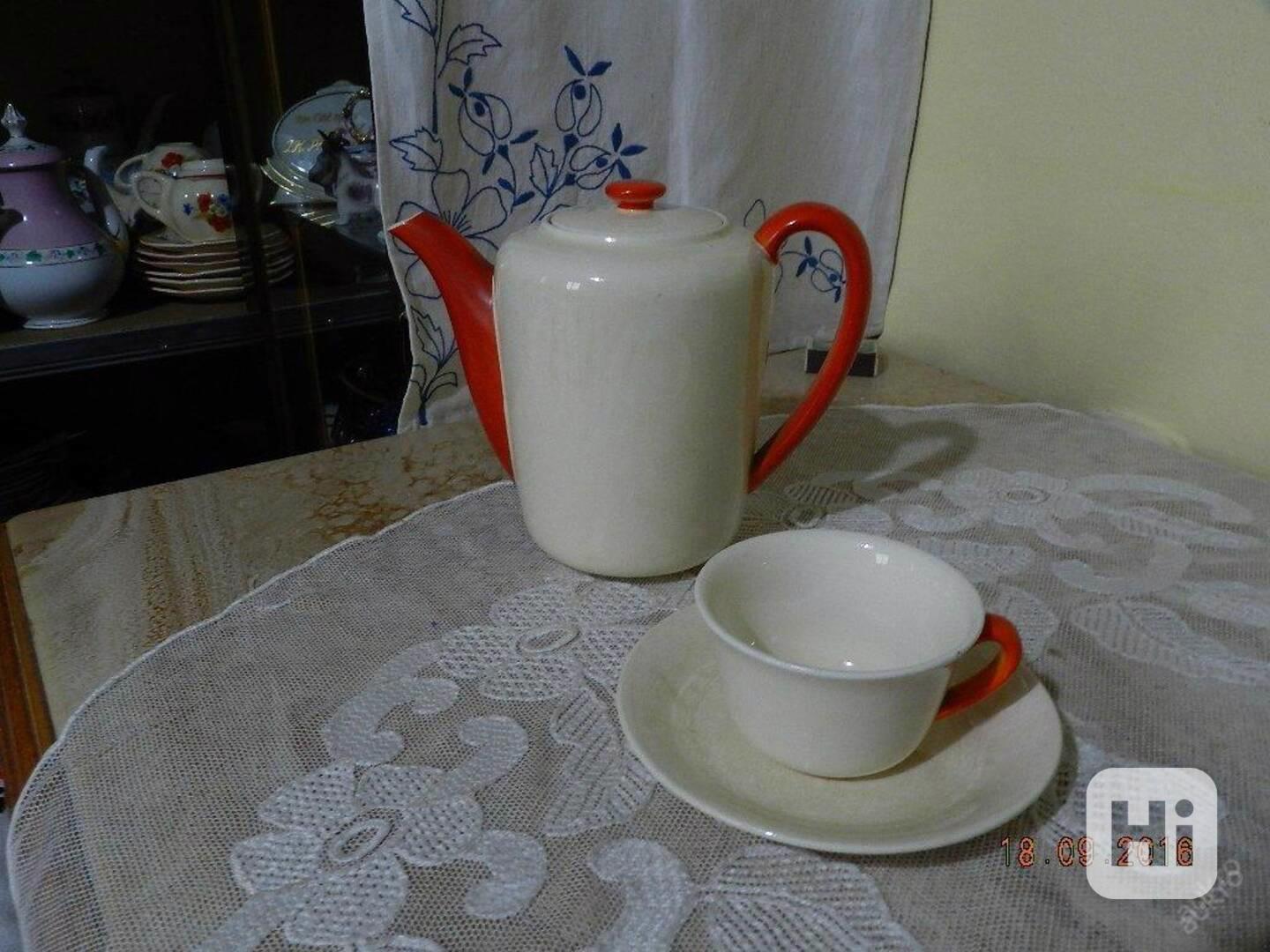 Krásná stará keramická konvice na kávu + hrnek s podšálkem, značeno.