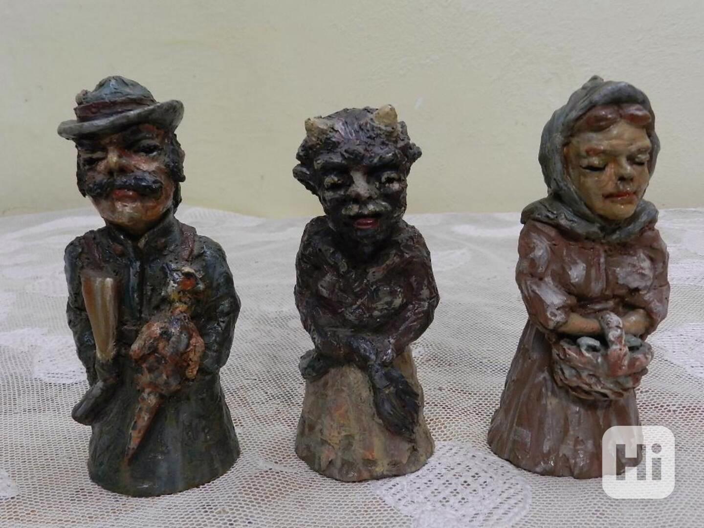 Špičkově zpracované staré Autorské figurky, Čert, Myslivec a Babka, keramika? - Značeno, Čechy.