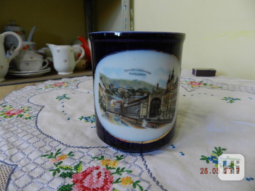 Krásný secesní větší kobaltový hrnek Karlovy Vary Kolonáda.