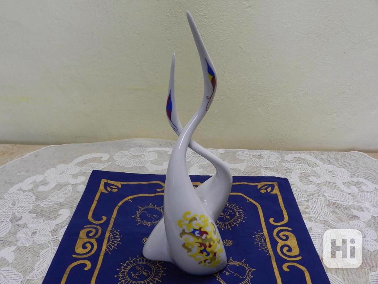 Zajímavá porcelánová plastika, Volavky, styl Brusel, vzácné barevné provedení - Royal Dux, Jaroslav Ježek, 2 pol. 20 stol.Rozměry: výška cca 38cm.