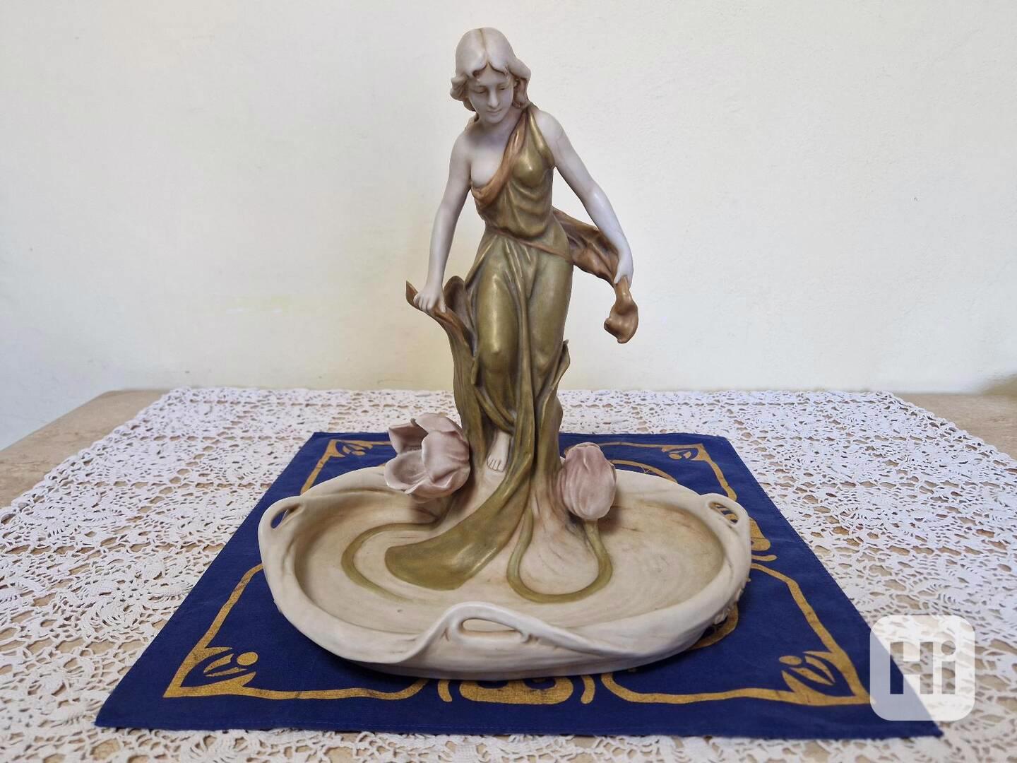 Krásná secesní porcelánová plastika s dívkou - Royal Dux, kolem 1920.Rozměry: výška 36cm, 31cm na 21cm.+U levé ruky patrné prasklinky, pravděpodobně celkem dobře opraveno, běžně není poznat, celkově pěkný kus.