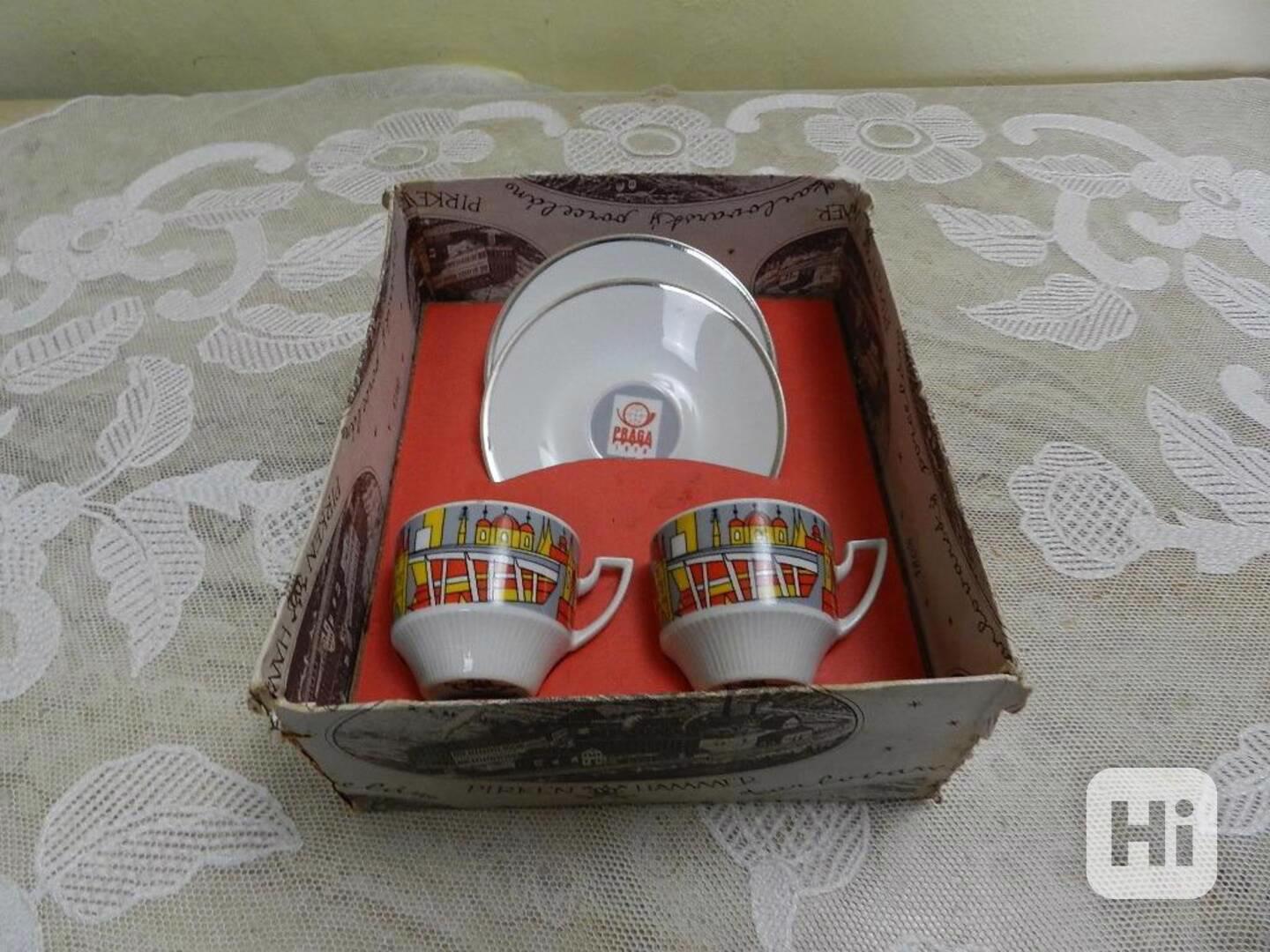 Zajímavé staré Hrnky s podšálky, Praha 1978 - Březová.Rozměry: výška hrnek 5,5cm, šířka 8cm, podšálek 11,5cm.