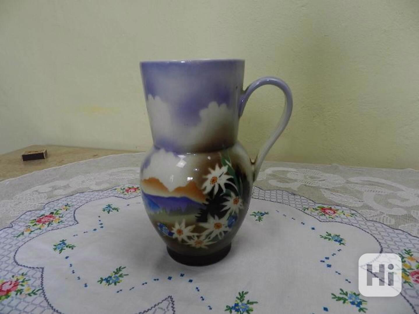 Krásný Art Deco Džbán s motivem krajiny a květin, stříkaný dekor, Značeno čísly.