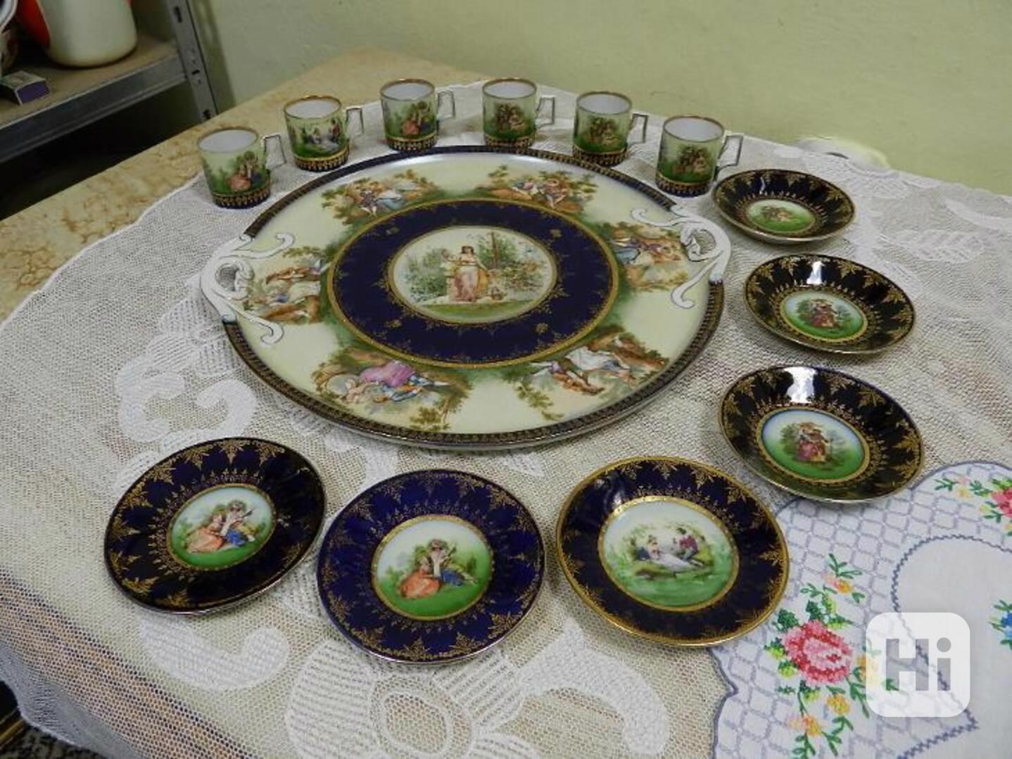 Krásný set, kobaltový tác + 6 Šapo - Karl Knoll Karlsbad Rybáře, 20 léta 20 stol.