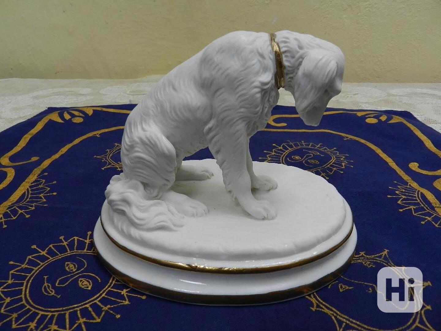 Krásná porcelánová plastika Psa, bílý neglazovaný biskvit, zlaceno - Značeno, Vídeň 1855.