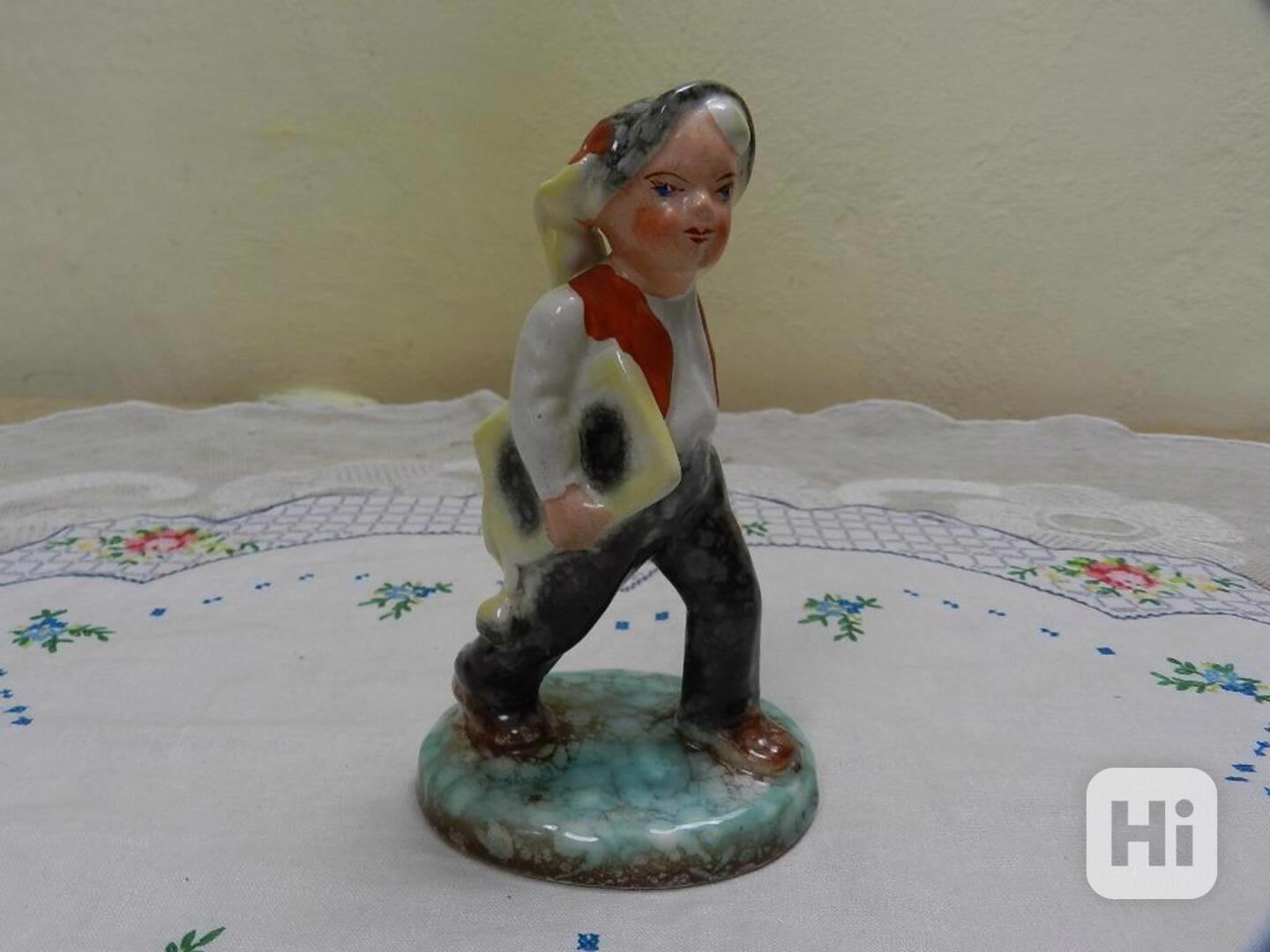 Hezká stará keramická soška, Chlapec s Aktovkou - Ditmar Urbach, Teplice, kolem 20 a 30 let 20 stol.
