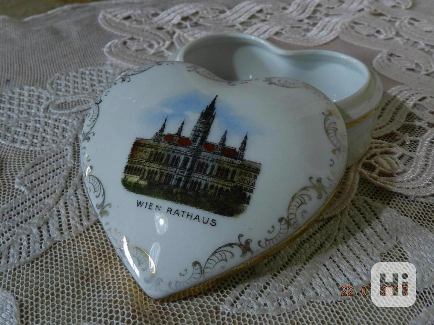 Krásná stará porcelánová dózička ve tvaru srdce, Wien Rathaus - Victoria Czech-Slovakia.