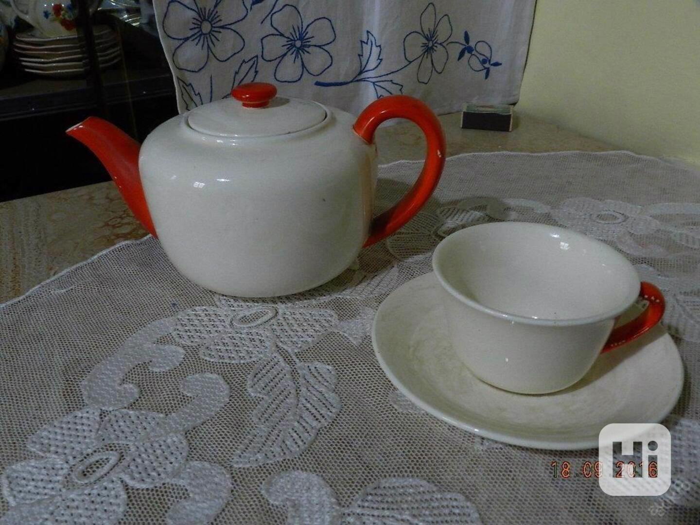 Krásná stará keramická konvice na čaj + hrnek s podšálkem, značeno.