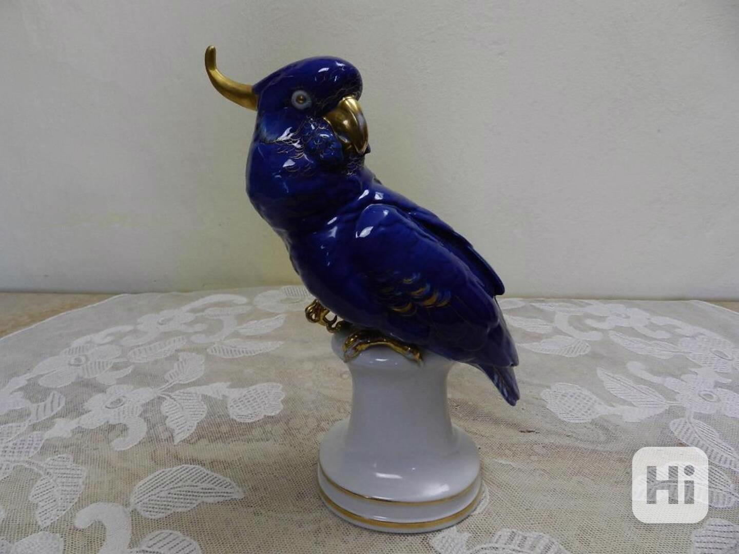 Krásný zlacený ručně malovaný Papoušek větších rozměrů, modrá barva - Volkstedt, Karl Ens, Německo, kolem 1930.
