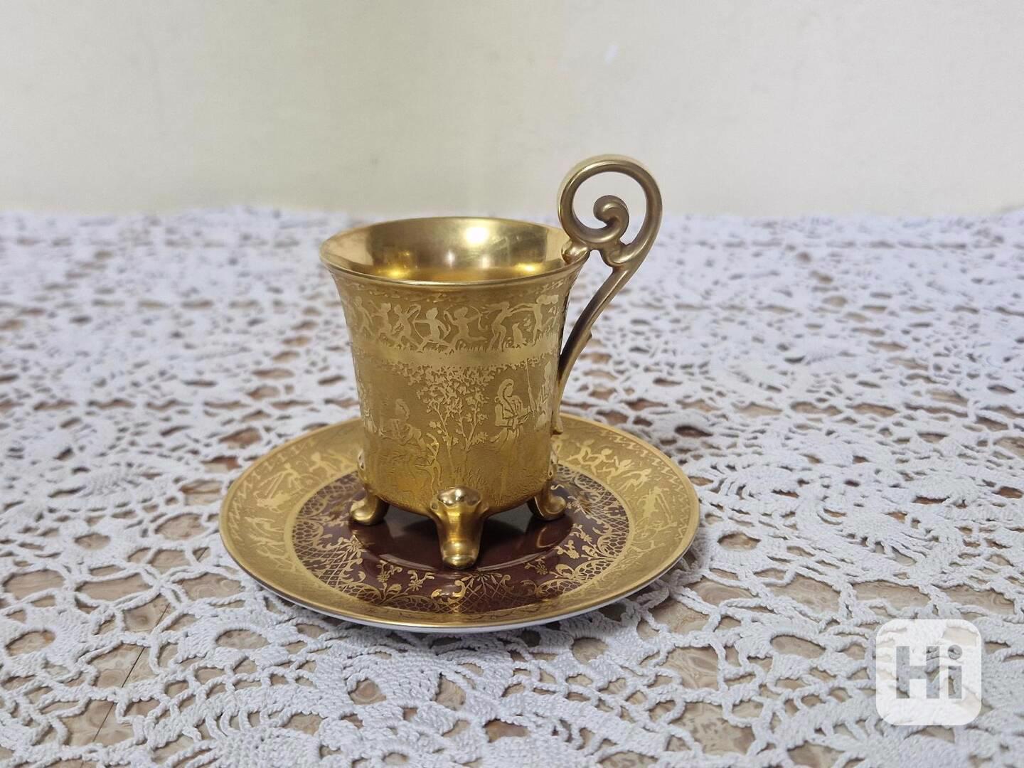 Luxusní empírový bohatě zlacený hrnek na nožičkách, barva celozlata, oroplastika - Karlsbad, 1 třetina 20 stol.Rozměry: hrnek výška 8,5cm, talířek 11,5cm.