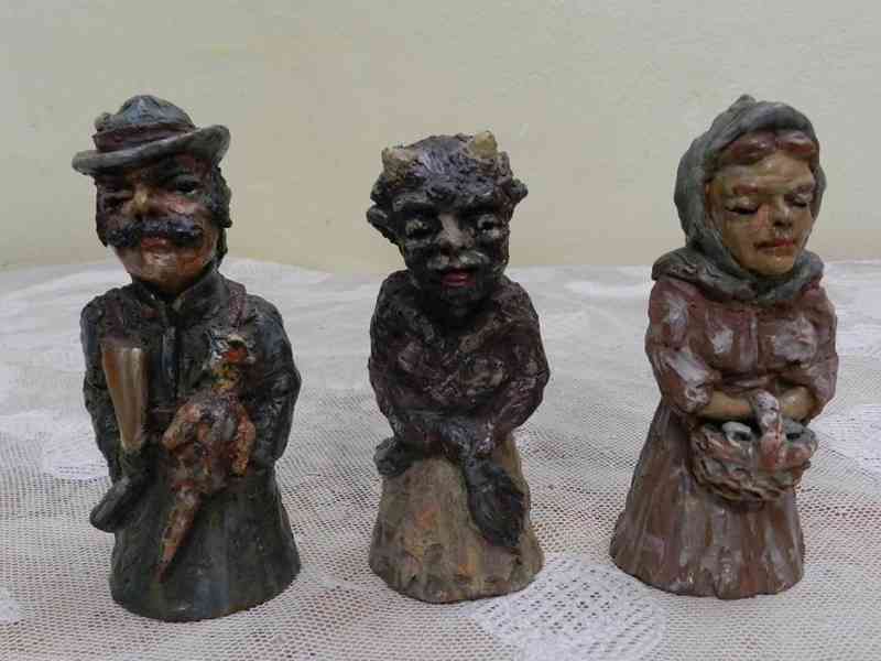 Špičkově zpracované staré Autorské figurky, Čert, Myslivec a Babka, keramika? - Značeno, Čechy.