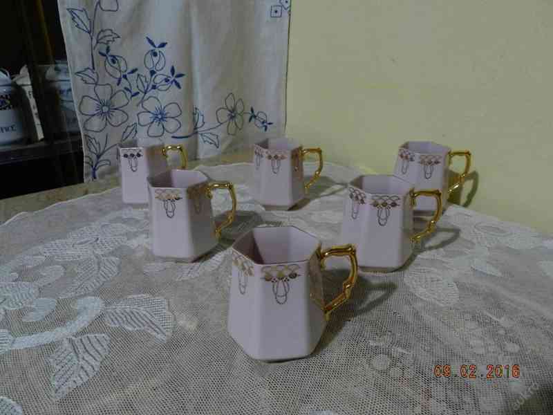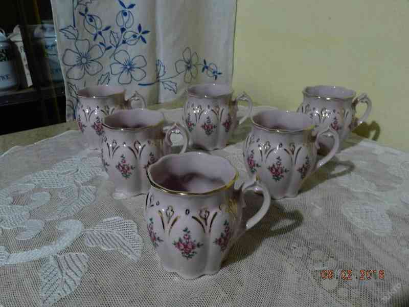 Šálky jsou zdobeny bohatým zlacením a jemným dekorem na vínovém podkladu. Ideální pro milovníky retro stylu nebo jako stylový doplněk do kuchyně.