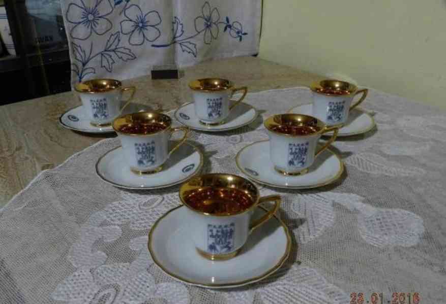 Stav: Velmi dobrý, barvy i zlacení jsou zachovalé. Jeden podšálek má mírný oťuk na hraně (viz detailní foto), ostatní kusy jsou v pořádku.