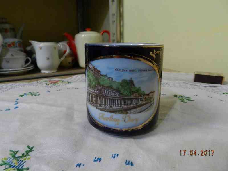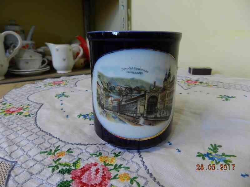Krásný secesní větší kobaltový hrnek Karlovy Vary Kolonáda.