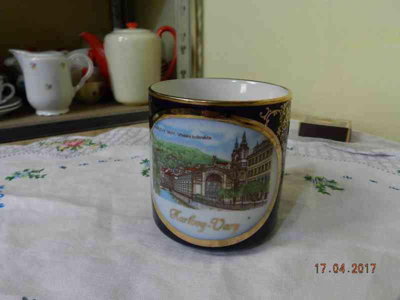 Krásný starý secesní kobaltový hrnek - Karlovy Vary Vřídelní Kolonáda.