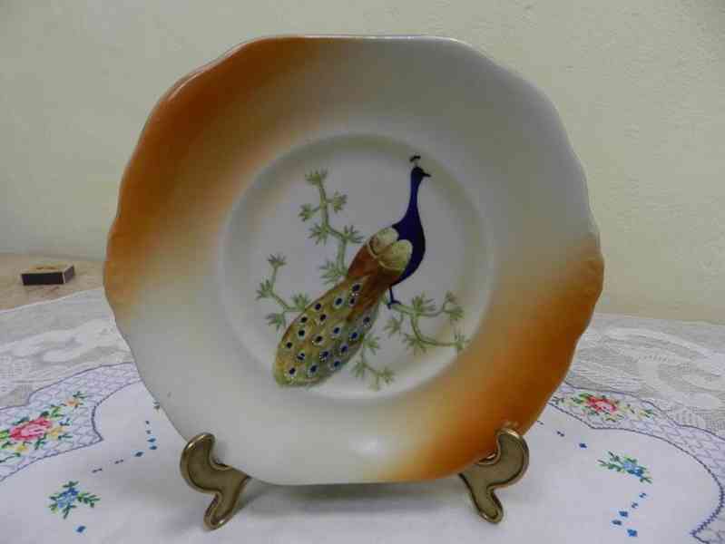 Krásný starý malovaný dekorační Talíř s pávem - Victoria Stará Role Czecho-Slovakia, kolem 1920.