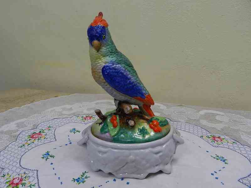 Krásná masivní figurální Dóza Papoušek, pestrá ruční malba - Dalovice, 1 pol. 19 stol.