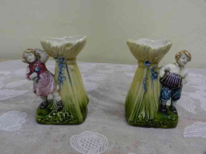Krásné secesní párové figurální Vázičky, Majolika, pravděpodobně Eichwald - vázy byly zakoupeny ve starožitnictví na Praze 1 za 600Kč, jako bonus přidávám dobový paragon z roku 1980.