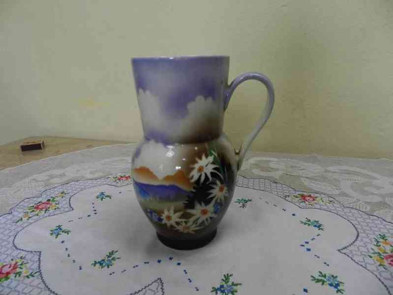 Krásný Art Deco Džbán s motivem krajiny a květin, stříkaný dekor, Značeno čísly.