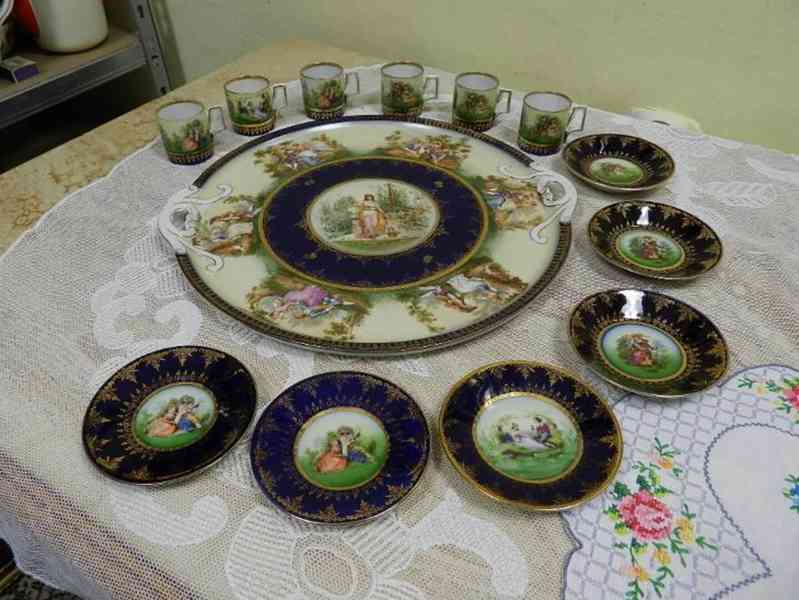 Krásný set, kobaltový tác + 6 Šapo - Karl Knoll Karlsbad Rybáře, 20 léta 20 stol.